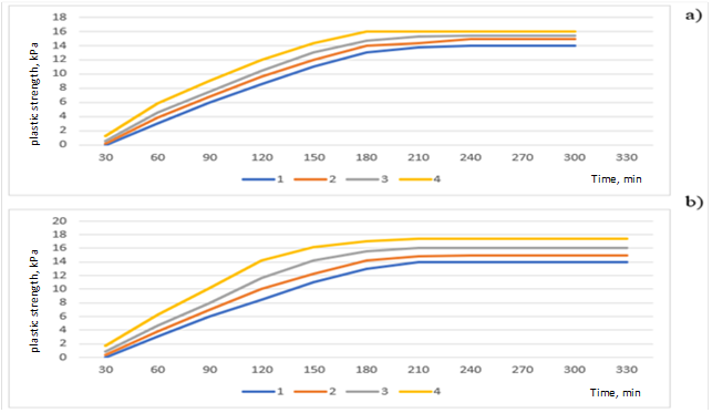 When adding 25, 50, and 75% powder to the experimental samples, their plastic strength was higher compared to the control sample. For example, with the addition of 25% powder, the plastic strength value is 14.8 and 15.3 kPa; 50% - 15.6 and 16.2 kPa; In 75% - 16.1 and 17.5 kPa, while in the control sample this indicator was 14 kPa.