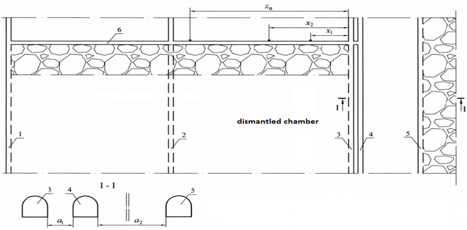 where a₁ – the width of the pillar(s) between the preparatory crosscuts of the chamber being dismantled;