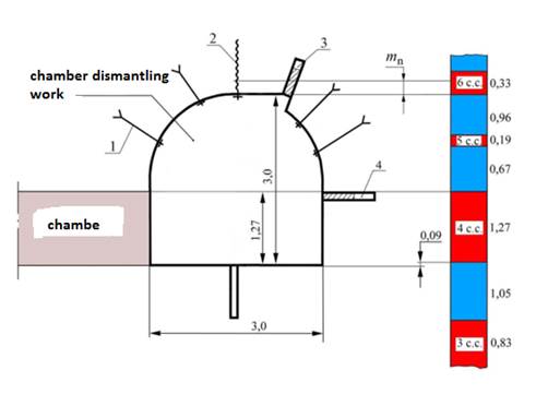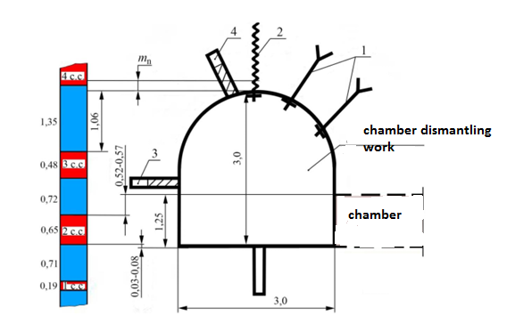 After the chamber lining is reinforced by the dismantling weld or after the dismantling weld is passed through and connected to the chamber lining, the expanded lining front void should be reinforced by installing wooden columns with a diameter of 0.16-0.2 m in 2-3 rows (between the lining reinforcement sections). The wooden columns must be installed within two days after the formation of the expanded lining front void. The number of columns and their installation locations, as well as the sequence of dismantling the chamber equipment, are defined in the "Dismantling Works Execution Project.