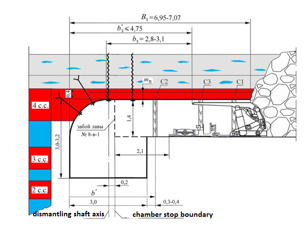Dismantling drifts are performed 7–10 days after excavation work, using a transverse section approach. This temporary pause is essential for reducing static load on the face support and the pre-face zone. It enables stress relaxation at the chamber edge, shifts the point of maximum support pressure deeper into the rock mass, and causes complete collapse of the immediate roof rocks.