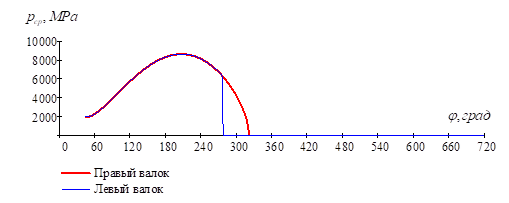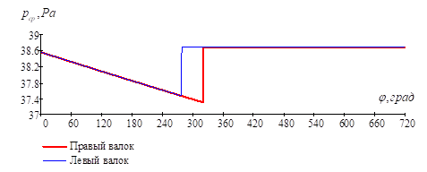 Рисунок 5. График изменения среднего контактного давления на металл правого и левого валка