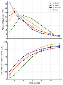 По кривым концентрации урана (верхняя диаграмма на рис. 1) заметно различие в начальной динамике выщелачивания между блоками. В варианте C (взрывное рыхление) уже к первому месяцу наблюдается резкий выход урана – концентрация U достигает ~40 мг/л, что существенно выше, чем в остальных опытах. Это объясняется тем, что взрывным воздействием сразу раскрыта значительная поверхность руды и образованы крупные каналы, из которых уран быстро вымывается кислотой. В блоке A (с ПАВ) тоже отмечается сравнительно высокий пик концентрации (~30 мг/л на втором месяце) – присутствие ПАВ обеспечило лучшую смачиваемость породы и вовлечение ранее недоступных участков рудного вещества, повышая отдачу урана в раствор. В отличие от них, в блоке B (биовыщелачивание) на начальных этапах концентрация нарастает медленно: за первый месяц менее 10 мг/л, пик (~25 мг/л) достигается лишь к 4-му месяцу. Задержка связана с временем на разгон бактериальной популяции и постепенное разложение сульфидов, сопровождающееся генерацией in situ окислителей. Тем не менее к 6-му месяцу микробный вариант выходит на сопоставимые уровни (около 30 мг/л) и удерживает повышенную концентрацию дольше остальных. Электрокинетический блок D демонстрирует промежуточное поведение: благодаря электроосмотическому продвижению кислоты концентрация урана быстро повышается к 2-му месяцу (~35 мг/л) и затем медленно снижается. При этом кривая D лежит выше, чем у других вариантов, на промежуточных этапах (3–6 месяц), что указывает на более полный охват выщелачиванием мелких поровых зон под действием электрического поля.