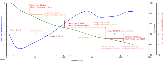 По результатам анализа выявлена начальная потеря массы (TGA) при 17.94°C, связанная с испарением влаги и адсорбированной воды. Дальнейшая потеря массы составляет 11.083 % (0.214 мг). Основной этап дегидроксилирования наблюдается в промежутке температур 212.44°C – 276.91°C, связанный с удалением гидроксильных групп (Si–OH), происходящих в аморфном диоксиде кремния. Дополнительная потеря массы составляет 6.223 % (0.120 мг) + 6.445 % (0.125 мг).