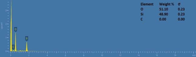 Разложение органических примесей и углеродсодержащих соединений наблюдается в интервале температур 543.68°C – 757.92°C. При этом потеря массы составляет 10.403 % (0.201 мг). Этот процесс связан с дальнейшей структурной перестройкой материала. Финальный этап структурных преобразований наблюдается при 822.53°C, что свидетельствует о возможной кристаллизации аморфного SiO₂ в кристобаллит или тридимит. Общая потеря массы на этом этапе составляет 3.502% (0.068 мг). При ~1000°C потеря массы сохраняется в пределах 59.895 %, что говорит о высокой термостойкости микрокремнезема. При температуре 757.92°C наблюдается экзоэффект, свидетельствующий фазовому переходу аморфного диоксида кремния. Также проведен элементарный анализ микрокремнезема АО «Узметкомбинат» (рис. 4), который подтверждает результаты вышеприведенных комплексных анализов. По результатам элементного анализа проба исследуемого микрокремнезема состоит из 51,10 вес.% кремния и 48,90 вес.% кислорода.