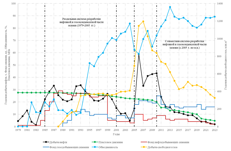 Keywords: development system, oil and gas condensate field, technological indicators, recovery rate, production, drilling, joint development, separate development, grid density, efficiency, water cut, reserves production, oil rim, oil recovery factor.