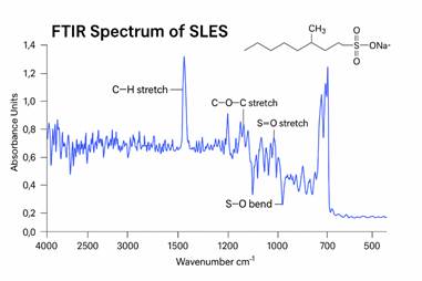 Химическая структура вещества SLES также определяется с помощью инфракрасной спектроскопии (FTIR). На FTIR-спектре наблюдаются следующие характерные пики: