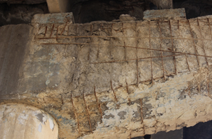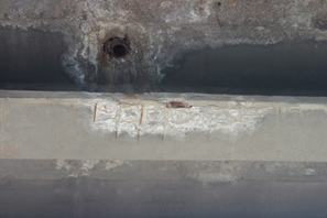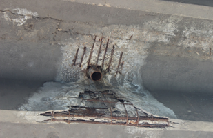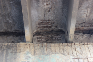 Из анализа данных, приведенных в таблицах 2 и 3, видно, что балки пролетного строения имеют существенные повреждения. Основной причиной появления этих повреждений явилось некачественное выполнение строительных работ. При строительстве путепровода водоотводные отверстия оказались заполненными асфальтобетоном или строительным мусором, что послужило причиной плохого отвода воды с проезжей части пролетных строений. При обследовании в ригелях опор выявлены повреждения в виде отслоения и отпадения защитного слоя бетона на боковых и нижних поверхностях, следов выщелачивания бетона. Арматура крайних каркасов и наружных сеток ригелей сильно корродированна. Диаметр стержней рабочей арматуры после коррозии равен Ø 25мм, т.е. степень пластинчатой коррозии составляет до 22 %. Степень коррозии арматуры наружных сеток – от 20 до 100 %, многие стержни оборваны и потеряли сцепление с бетоном. Силовых трещин и деформаций в ригелях не выявлено (рисунок 1). Наиболее часто повреждения изоляционного слоя наблюдаются у тротуарных бордюров, водоотводных трубок и деформационных швов (рисунок 1). Вода постепенно разрушает бетон плиты балок, арматура покрывается ржавчиной, разрушает защитный слой, бетон отслаивается. Отслоение бетона на боковых гранях плиты проезжей части наблюдается по всей длине крайних балок. Кроме того, в отдельных местах из обычного железобетона обнаружены многочисленные трещины и участки пористого бетона – признак его низкой прочности [1; 3; 6].