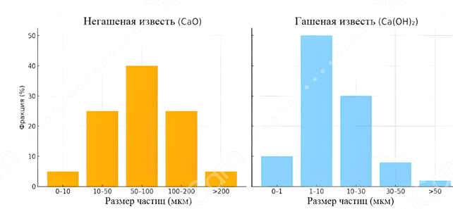 Размеры частиц известковой пыли в гашеном и негашеном состоянии определялись методом лазерной дифракции (1 рис), D50 ≈ 65 мкм. Таким образом, средний размер частиц негашеной извести составляет около 65 мкм, а распределение частиц различно, то есть они имеют разные размеры. Это свидетельствует о том, что материал был получен в результате механического измельчения. D50 ≈ 8 мкм. Установлено, что средний размер частиц гашеной извести значительно меньше – 8 мкм, и состоит из однородных и мелких частиц. Процесс гашения (экзотермическая реакция) заключается в измельчении извести и образовании тонкого слоя гидратированной структуры.