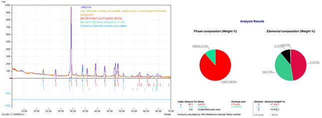 На основании фаз, определенных методом рентгеновской дифракции, элементный состав образца следующий: кислород (O) – 47,4%, кальций (Ca) – 41,7%, углерод (C) – 10,6%, водород (H) – 0,3%, наличие 89,5% кальцита (CaCO₃) в образце подтвердило, что элементы Ca, C и O имеют высокую долю в составе. Присутствие 11,5% портландита (Ca(OH)₂) подтверждает присутствие элементов Ca, O и H.