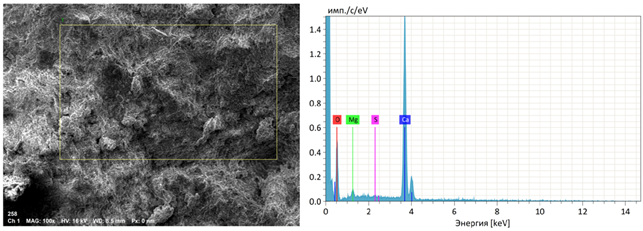 Согласно результатам анализа образцов принудительной карбонизации, с использованием электронного микроскопа (рис. 3), основные изменения в структуре образца приобрели мраморовидную текстуру, а изображения характеризуются признаками, типичными для кристаллической структуры. На снимке зафиксировано изменение волокнистой и зернистой структуры различной формы и размеров, а также появление кристаллических фаз в составе. Эти структуры указывают на то, что образец имеет сложную природу, представляет собой смешанный минерал или окисленный материал. Количественный состав следующих элементов на основе анализа EDS приведен в таблице 3.