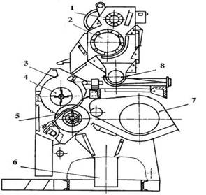 1 – подающий ролик; 2 – выравнивающий барабан; 3 – рабочая камера; 4 – смеситель; 5 – пильный цилиндр; 6 – щелевая труба; 7 – воздушная камера; 8 – шнек для осадка; 9 – сетчатая поверхность.