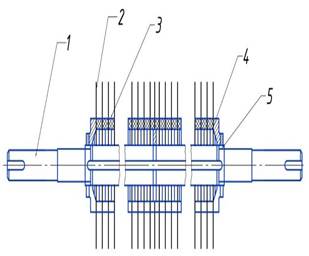 1 – вал цилиндра пилы; 2 – пильные диски; 3 – прокладки между пилами; 4 – шайбы; 5 – правая и левая зажимные гайки в комплекте.