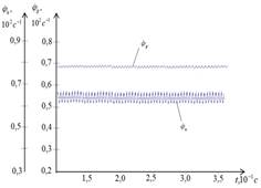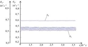 С помощью программы MathCAD было получено численное решение дифференциальных уравнений (1), полученных в результате теоретических исследований. На основе численного решения дифференциальных уравнений (1) были получены законы изменения угловых скоростей двигателя и цилиндра легкой пилы (рис. 7).