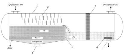 1 – корпус сепаратора; 2 – подвешенные перегородки; 3 – сетка для предотвращения пенообразования; 4 – штуцер для выгрузки механические примеси; 5 – перегородка для переливания накопленные чистого газового конденсата; 6 – установка для предотвращения вихра; 7 – штуцер для выхода газового конденсата