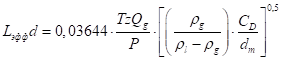 где, Lэфф – эффективная длина аппарата, м; d – внутренний показатель, м; T – рабочая температура аппарата, К; P – рабочая величина давления, кПа; z – коэффициент сжимаемости газов; Qg – производтелность, нм3/ч; ρg, ρl – плотность газа и жидкости при разделении, кг/м3; CD – коэффициент трения (капли жидкости непрерывного потока газа); dm – самый маленький диаметр устройства, разделяемого жидкостью, мкм.