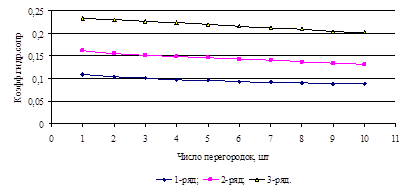 Из таблицы 2 видно, что с увеличением числа перегородок первого ряда гидравлическое сопротивление изменяется от 420 Па до 335 Па, и второго ряда от 617 Па до 501 Па. Такую картину можно наблюдать на третьем ряду, т.е. этот показатель составлял величину в пределах 891 Па 774 Па. Это объясняется тем, что с увеличением числа подвесных перегородок и ряда перегородок самого начала и до конца сепаратора результат приводится к повышению гидравлического сопротивления сепаратора, то есть оно увеличивается после первого ряда – 3670 Па, после второго ряда – 5540 Па, после третьего ряда – 8320 Па. На рисунке 2 приведены результаты по изменению коэффициента гидравлического сопротивления предлагаемого аппарата в зависимости от числа перегородки.