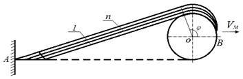 где V0 – линейная скорость вращения шпинделя, равная V0 = rш·ωш, rш – радиус шпинделя, ωш – угловая скорость вращения шпинделя. Уравнение движения хлопкового волокна в виде гибкой растяжимой нити, наматываемой на шпиндельный барабан, описывается в виде: