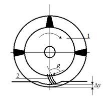 1 – эпициклическое движение шпинделя в рабочей камере аппарата, 2 – гипоциклическое движение шпинделя в рабочей камере аппарата, Fτ, Fn – тангенциальная и нормальная силы при наматывании хлопкового волокна на шпиндель согласно эксперименту [4]