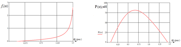 На основании полученных расчетных формул (59) – (61) в среде программирования Mathcad-15 построены графики, при следующих данных: l = 0,2 см, Е = 2,5 · 105 Па, d = 0,02 см, α = 100 ÷ 800, где при α = 400 величина прогиба стержня составляет f = 0,1002 см. По этим расчетным данным построена графическая зависимость (рис.4) изменения усилия Р от угла α между касательной к кривой прогиба в точке О и осью OX. Анализируя график видим, что усилие Р до величины α = 400 ÷ 600 увеличивается, затем снижается до 0. В результате численных расчетов максимальное усилие составило Рмакс = 80,06 мН для одной ворсины щеточного съемника.