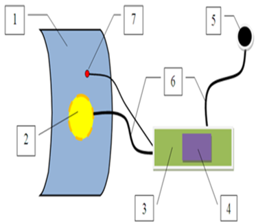 1-фартук рабочей камеры: 2 нагревательный элемент; 3 терморегулятор; 4 панель управления: 5 электропитание; 6 электрический провод: 7 датчик измерения температуры
