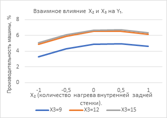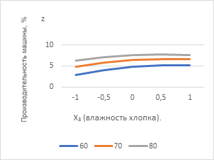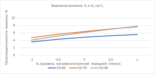 Результаты показывают, что в процессе нагрева рабочих поверхностей производительность увеличивается до определенного уровня. Из графиков взаимного влияния X₁, X₂ и X₃ видно, что повышение температуры внутренних стенок камеры способствует увеличению производительности. В максимальном случае при температуре передней внутренней стенки 80°C и задней внутренней стенки 80°C достигается наивысшая производительность, однако при влажности хлопка выше 12 % наблюдается постепенное снижение эффективности. Оптимальными параметрами являются 80°C для передней внутренней стенки и 70°C для задней внутренней стенки, при которых производительность машины достигает 7,6 %.