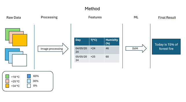 Figure 1 demonstrates the general workflow of the algorithm. It poses raw satellite images undergo preprocessing to extract temperature and humidity features, which are then input into a support vector machine (SVM) model to estimate the probability of wildfire occurrence.