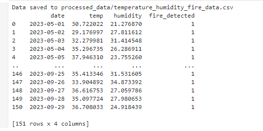 A total of 151 daily images were analyzed for LST and fire occurrence, while 3624 records were processed for relative humidity calculations. The extracted data includes average temperature, relative humidity index, and binary fire presence indicators. This structured dataset serves as a foundation for training machine learning models.