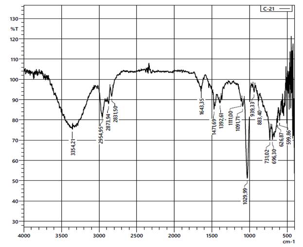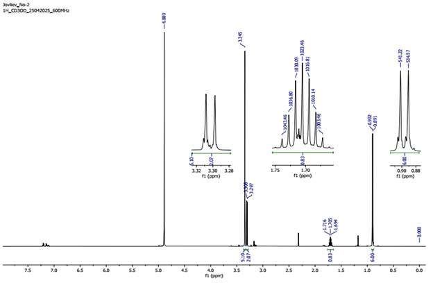 При анализе спектра ¹H ЯМР синтезированного вещества были выявлены сигналы, соответствующие структуре изобутил метилового эфира (C₅H₁₂O). δ 3.33 м.д. (триплет, 3H, J ≈ 6.9 Гц) относится к метокси- группе (–OCH₃), соответствующей протонам метильной группы эфира. δ 3.43–3.45 м.д. (мультиплет, 2H) – сигнал метиленовой группы (–CH₂–O–), протоны которой сдвинуты в область высоких полей из-за связи с атомом кислорода. δ 1.70–1.76 м.д. (мультиплет, 1H) – сигнал центральной метиловой группы (–CH–), связанной с двумя метильными и одной метиленовой группами. δ 0.89–0.91 м.д. (дублет, 6H, J ≈ 6.7 Гц) – сигналы двух метильных групп изобутильной цепи, связанных с метиловым атомом. Сигналы в спектре полностью соответствуют структуре молекулы и четко подтверждают образование эфирной группы. Сигналы незамещенных гидроксильных групп (–OH) не наблюдались, что свидетельствует о полном завершении реакции.