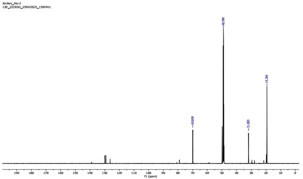 В спектре ядерного магнитного резонанса углерода-13 (¹³C ЯМР), синтезированного изобутил метилового эфира, измеренном в растворителе CDCl₃ при частоте 150 МГц (рис. 3), были идентифицированы следующие резонансные сигналы: δ = 63.99 ppm – сигнал углерода метоксильной группы (–OCH₃). Этот пик соответствует атому C, связанному с кислородом в метильной части эфирной группы.