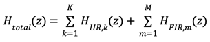 One representative realization of such a hybrid method can be mathematically described by defining two sets of transfer functions. Suppose HIIR,k(z) denotes an IIR filter for the k-th low-frequency channel, and HFIR,m a FIR filter for the m-th high-frequency channel. The overall system can be expressed as