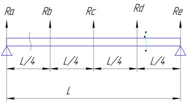 Согласно закону, в первом подходе будем рассматривать колосниковый стержен новой геометрической формы в виде равномерно распределенной балки, опирающейся на пять опор. Уравнение движения при составлении уравнений не учитывается: из-за малых ударных нагрузок стержена, перпендикулярных радиальному направлению, влияния вибрации других стрел колосниковой решетки, а также нагрузок стержена в осевое направление. Представляем себе упомянутые выше неучтенные суммы в виде неразрезанной балки на опоре. Для динамического расчета примем эту балку как однопролетную, без учета всех промежуточных опор, не определенных статически, и заменим их силой, действующей на балку с неизвестной силой реакции.