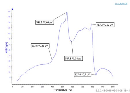 In the thermal curve, the endoeffect formed at the temperature of 393.8℃ is related to the release of hydrate waters, the one at the temperature of 541.8℃ is the release of chemically bound water, and at 587.3℃ it is the modification change of quartz. From the exothermic effect that occurred, 787.2℃ is due to the phase transition temperature of two lead silicates to lead silicate, and the other one is due to the liquid state of lead silicate at 827.6℃. Thus, using chemical reagents, as well as natural quartz sand and lead concentrate, samples of transparent-colorless glass materials were synthesized and their main functional and physicochemical properties were comprehensively studied. DTA and TG measurements of the Khonjiza lead concentrate were performed on a STA PT 1600 synchronous thermal analyzer manufactured by the German company Linseis, measurements were carried out in an oxidizing environment at a speed of 20 S/min.