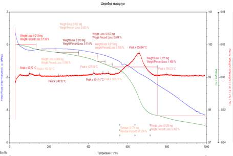 The temperature of Sherabad quartz sand started at 25℃ and thermal processes remained constant up to 550℃, with a high exoeffect observed between 550℃ and 735℃. This is due to the partial melting of the material. If we examine the mass, the mass decreased steadily from the initial temperature to 535℃. From 535℃ to 730℃, the mass decreased sharply by a small amount, and by the end of the process, the mass decreased by 2.5%.
