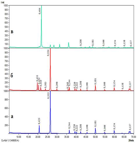 The mineralogical composition of Ugun quartz sands was studied using the X-ray phase method (Fig. 5). The mineralogical composition of this natural sample of quartz sand (Fig. 5a) is represented mainly by β-quartz minerals (d = 0.344; 0.322; 0.222; 0.212; 0.197; 0.181; 0.166; 0.154; 0.138; 0.137 nm), a small amount of calcite (d = 0.226 nm), albite (d = 0.244 nm), it was also experimentally established that the diffraction lines of low intensity belong to clay and organic inclusions in quartz sand.