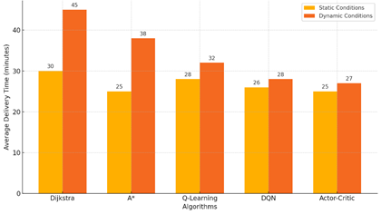 As shown in Figure 2, the graphical representation illustrates the average delivery times under static versus dynamic conditions for reinforcement learning algorithms (Q-Learning, DQN, and Actor-Critic) and classical algorithms.