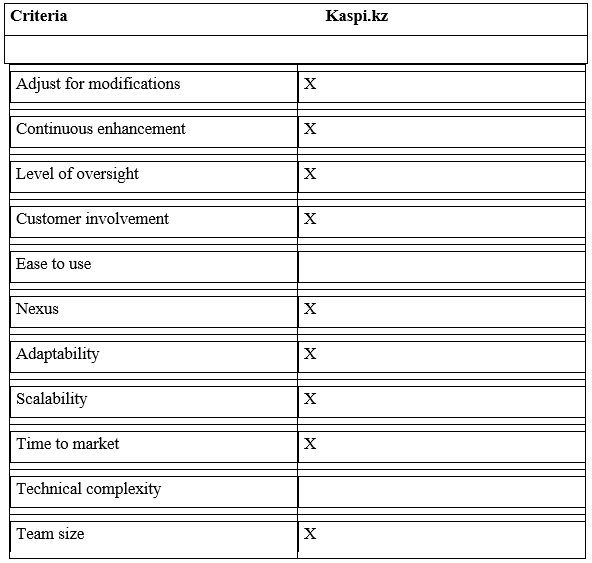 For this study, we gathered data in several stages. Initially, we focused on identifying large-scale agile frameworks, with a total of six such frameworks recognized through a literature review. In the second phase, we aimed to establish criteria facilitating a comparative evaluation of these frameworks within the business needs of Kaspi. Table 2 illustrates the criteria employed in benchmarking the frameworks. It is apparent that the majority of these criteria are shared among Kaspi.kz.