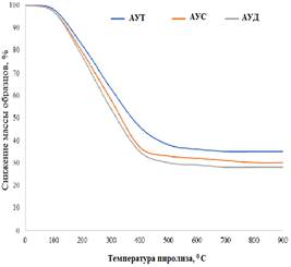 Резкое снижение массы наблюдается до 500°С, и в этом температурном диапазоне можно наблюдать максимальную степень разложения органических веществ в составе образцов, при этом потеря массы составляет примерно 62–70 %.