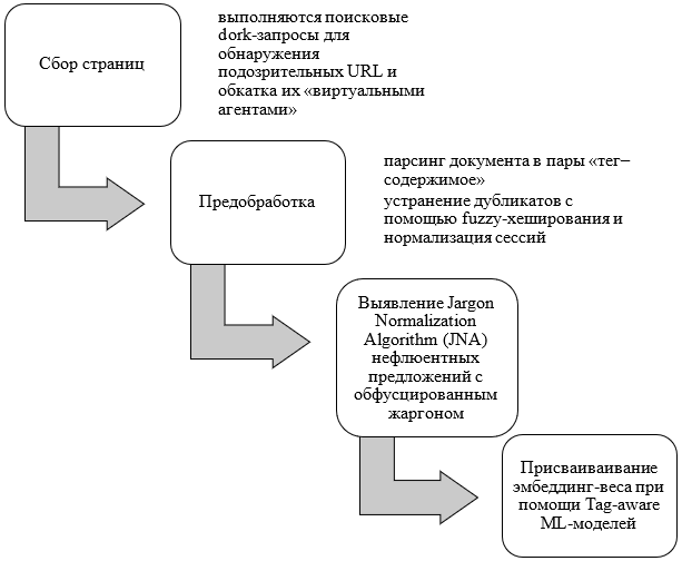 Одна из таких систем, DMOS (Defacement Monitoring System), реализует четыре ключевых этапа (рис.1.). На этапе сбора страниц выполняются поисковые dork-запросы для обнаружения подозрительных URL и обкатка их «виртуальными агентами», которые обходят сайты и сохраняют их HTML. На этапе предобработки происходит парсинг документа в пары «тег–содержимое», устранение дубликатов с помощью fuzzy-хеширования и нормализация сессий. Далее алгоритм Jargon Normalization Algorithm (JNA) выявляет нефлюентные предложения с обфусцированным жаргоном посредством униграммного языкового моделирования и восстанавливает оригинальные ключевые фразы по фонетическому (Pinyin) или графическому (Four-Corner System) сходству при низком уровне ложных срабатываний. На завершающем этапе Tag-aware ML-модели, такие как Tag-aware Hierarchical Attention Network (THAN), используют многоуровневое внимание: сначала на уровне слов, затем на уровне «тег–предложение», где каждому тегу присваивается эмбеддинг-вес. [2].