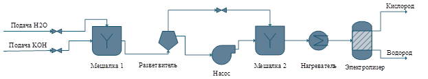 Технологический процесс электролиза состоит из нескольких этапов (рис. 1). Вода и гидроксид калия (KOH) сначала закачиваются в мешалку 1 и смешиваются в пропорции 4:1, а затем по байпасной линии поступают в мешалку 2 для хранения. Нагреватель 1 нагревает подаваемую жидкость таким образом, чтобы уменьшить сопротивление щелочного раствора и увеличить скорость переноса ионов, затем раствор проходит через электролизер. К крайним монополярным электродам подводится электрический ток.