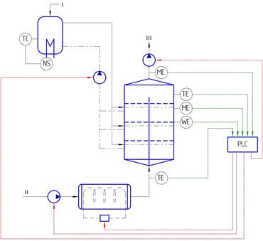 The functional scheme (Fig. 5) includes sensors for temperature (TE), humidity (ME), and mass (WE), with a programmable logic controller (PLC) controlling the process.