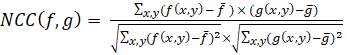 f(x,y) and g(x,y) represent the pixel intensities at location (x,y) of images f and g respectively.
