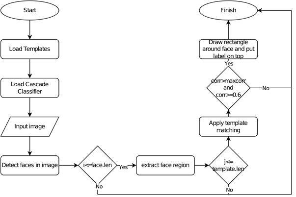One approach to multi-view face recognition is to use multiple templates or views the face of a person. These templates can be acquired by capturing images of the person from different angles or by using pre-existing templates. However, using multiple templates can be computationally expensive and requires storing and matching a large number of templates. To address this issue, a template adoption method can be used. This approach involves selecting a single template for each person and adapting it to different poses. This reduces the computational cost of matching and storage while still allowing for accurate recognition across multiple views. The system uses template matching with multiple scales to each template, to find the best match for the current face in the reference image. It first resizes the face template to different scales and then applies template matching using the face region of the current face in the reference image. It selects the template with the highest correlation coefficient as the best match. Finally, it draws a bounding box around the matched face in the reference image and labels it with the name of the matched person. All these steps are illustrated in Figure 1 flowchart of the implemented system for the Pose-Invariant Face recognition system with template adoption.