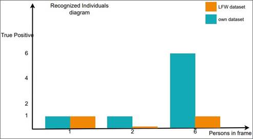 In the case of Figure 3 the system recognized in the frame all 6 people out 6 using a custom data set. True Positives(TP) in this example is 6 against 1 which was recognized by the same code, but using the LFW dataset. True Negative(TN) is 0 in all examples because it did not annotate any non-face things. False Negative(FN) is 0 for system recognition using its dataset in a frame with 6 people because it identifies all six persons. However, a system that uses the LFW dataset has FN = 5, meaning 5 people out of 6 were wrongly identified. The system with the LFW dataset incorrectly identified 2 things as persons. So, FP = 2. All these data are clearly shown in Figure 4 which was generated by an auxiliary program.