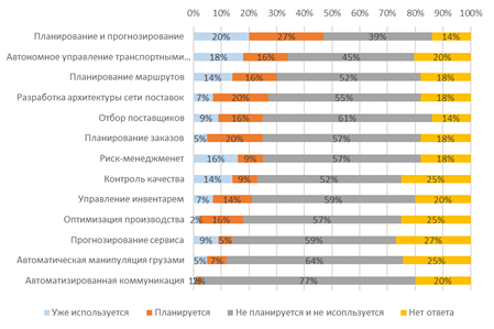Согласно результатам опроса, наиболее востребован (уже используется или планируется использование) ИИ в таких функциональных областях бизнеса, как планирование и прогнозирование, управление транспортными средствами, планирование маршрутов.
