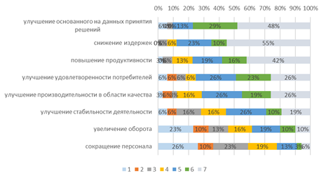 Рисунок 2. Ожидаемый эффект от применения ии в разрезе функционалов (1 - абсолютно не согласен, 7 - полностью согласен) (Raab, Fischer, & Brandtner, 2025)