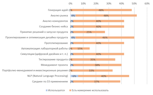 Согласно результатам опроса, намерение использовать ИИ наиболее высоко (более 45% положительных компаний) в таких областях, как генерация идей, анализ рынка и проектирование.