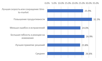 Как видно на диаграмме, наиболее ценным эффектом внедрения ИИ представляется повышение продуктивности, хотя ожидается также и большая гибкость в принятии решений, повышение скорости выведения продукта на рынок и т. п.