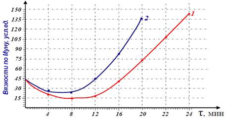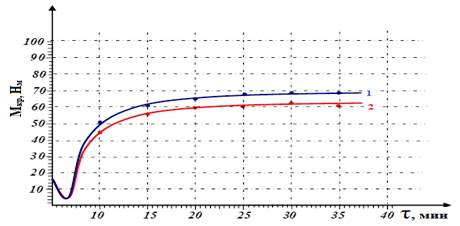 Рисунок 3. Кинетические кривые вязкости по Муни резиновых смесей на основе каучука СКМС-30 АРКМ-15 при температуре 324 К