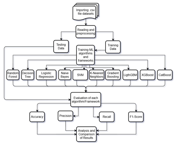 Decision-tree learners (DT, random_state = 42) split features recursively in order to maximize a purity measure, creating an interpretable hierarchy of rules [14, p. 2]. Random Forest accomplishes this in extension by training 100 such trees on boot-strapped sets of features and aggregating the votes across all CPU cores (n_estimators = 100, n_jobs = -1, random_state = 42), creating a more stable ensemble [15, p.3]. Gradient Boosting adds 100 shallow trees in a sequence, each fitted on the previous residuals (random_state = 42, n_estimators = 100), so that loss is progressively minimized by stage-wise changes [16, p. 2]. Linear-kernel Support Vector Machine (C = 1.0) has maximum margin between the classes and can be kernel-lifted to non-linear decision planes [17, p. 4]. Probabilistic Naïve Bayes (random_state = 42) assumes feature independence under conditionality, giving a simple baseline for text-like data [18, p. 1]. Instance-based K-Nearest Neighbours (k = 5) classifies a sample by majority vote among its five nearest neighbours in Euclidean space without requiring explicit training [19, p. 3]. Of all the modern gradient-boosting toolkits, XGBoost sequentially grows 100 depth-6 trees (learning_rate = 0.1, eval_metric = log-loss, random_state = 42, label_encoder = False) with regularized, sparsity-aware splits [20, p. 2]; LightGBM uses histogram binning and leaf-wise growth (boosting_type = gbdt, num_leaves = 31, n_estimators = 100, learning_rate = 0.1, max_depth = -1, random_state = 42, verbose = -1) for memory-caching large-scale training [21, p. 3]; and CatBoost avoids target leakage by ordered boosting while naturally handling categorical features (iterations = 100, depth = 6, learning_rate = 0.1, loss_function = Logloss, eval_metric = Accuracy, random_seed = 42, verbose = 0).