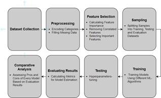 Pre-processing. Before beginning to build the model, it is necessary to prepare the data for training. The pre-processing stage includes encoding categorical variables and handling missing values. Typically, missing values are filled with mean/median values for numerical data and mode (most fre- quent classes) for categorical data. Most algorithms can only work with numerical values, so when dealing with categories, they need to be transformed. There are two types of categorical encoding: Label Encoding and One-Hot Encoding. In Label Encoding, each category is assigned a unique number to replace it. In One-Hot Encoding, a separate column is created for each category, indicating whether the variable belongs to that category or not (values 0 - not belong, 1 - belong). There is also Ordinal Encoding - a special case of Label Encoding, where category IDs are assigned in ascending order depending on their influence on the target variable (target). In our experiment, we will apply Label Encoding as a more universal type of encoding.